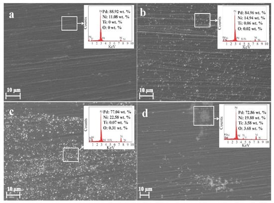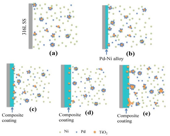 In Figure 7, Pd and Ni correspond to their cations and metallic complexes and also partly adsorb on hydrophilic TiO2 particles in the solution. All elements are expected to be uniformly distributed in the electrolytic bath before electrodeposition (Figure 7a). When a voltage was applied to 316L SS, Pd and Ni were reduced on the 316L SS surface first (Figure 7b). Pulse current-assisted complex ions and nanoparticles can move to the surface of the cathode more easily. Furthermore, less adsorbed hydrogen is generated during pulse deposition [22]. The palladium content is always higher than that of nickel in the coating compared with their contents in the electrolytic bath, which indicates that the reduction rate of Pd is faster than that of Ni. Normally, a higher redox potential and deposition current efficiency results in preferential metal electrodeposition.