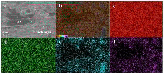 To further understand the distribution of titania in a composite coating and elemental mapping of a special area on the specimen that was obtained from the electrolyte containing 15 g L−1 TiO2 are presented in Figure 4. In the mappings, Pd and Ni are uniformly distributed, whereas Ti and O display opposite results. EDS spectra of this sample were obtained at different locations. The elemental compositions (wt.%) in a Ti-rich area (point B in Figure 4a) are 69.70% Pd, 18.28% Ni, 5.87% Ti, and 6.15% O, whereas the contents in another area (point A in Figure 4a) are 77.73% Pd, 21.76% Ni, 0.18% Ti, and 0.33% O. There are remarkably different contents of Ti in the two areas. Therefore, the results confirm that the excessive addition of TiO2 particles promote its agglomeration and create a non-uniform morphology in the composite coating.
