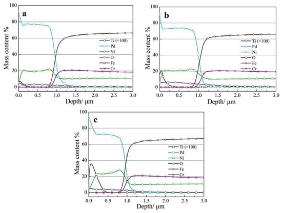 Clearly, the thickness of the composite coatings is approximately 1 μm, and all curves for the mass contents of Pd and Ni show similar shapes in the three figures. There is no doubt that the content of Ti element in composite coatings exhibit an upward trend with an increase in TiO2 particles in the electrolyte. According to Guglielmi’s two-step adsorption model [29], first, the particles would loosely adsorb on the cathode, which is dominated by the particle concentration in the electrolyte, whereas the second step mainly depends on the overpotential, which is a type of strong adsorption. Hence, when the operating conditions are constant, the number of insoluble particles in the electrolytic solution determines the inert particles contained in the composite coatings. Note that TiO2 particles are mostly distributed in the external part (0.5 μm) of the entire coating. Similar research results were also found by Grari et al. [30] and Calderón et al. [31]. First, as explained hereafter, mobility of metallic cations is higher than oxide particles. Thus, cations adsorption will be electrically assisted. Adsorption of oxide particles needs to be surrounded by metallic cation before being adsorbed. The competition between this two-step privilegiate is the metallic part in inner layer and oxide in outer layer. Second, these results could be related to the stronger electronic affinity of the Pd-Ni alloy compared with that of the 316L SS surface to oxide complexes [32]. Therefore, a small quantity of Ti element is found in the interior parts of the coatings near the coating/316L SS interface. In addition, a slightly decrease in Ti element, a decrease in Ni element and an increase in Pd element in the outermost layer of the coating are observed. It is probably because of the power-off-delay effect. The double layer at coating/solution interface can be considered as a plane-parallel capacitor after the power-off of the electrodeposition circuit. Capacitor discharge continues for a while but the double layer potential decreases with the time evolution after the power-off of electrochemical workstation. Owing to the overpotential of Pd electrodeposition is smaller than that of Ni, more Pd will be electro-reduced with the double layer potential decreasing at the last.