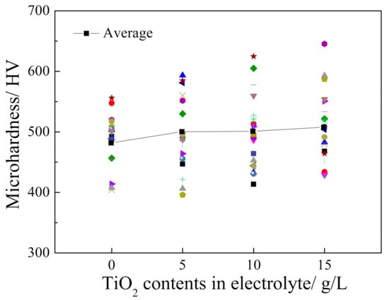 All tested microhardness values of the Pd-Ni alloy coating and Pd-Ni/TiO2 composite coatings and the average microhardness values of these samples are shown in Figure 8. Apparently, the composite coatings have a wider range of microhardness values in comparison with that of the Pd-Ni alloy coating. Additionally, the microhardness values of the Pd-Ni/TiO2 composite coatings increase with an increase in TiO2 particles in the electrolytic bath. The average microhardness value of the Pd-Ni alloy is approximately 481.7 HV. With the addition of 5 g L−1 TiO2 in electrolytic bath, the average microhardness value of obtained specimen increases to 500.1 HV, and the average microhardness values of other specimens that were deposited from the electrolyte containing 10 g L−1 and 15 g L−1 TiO2 are 500.9 HV and 507.6 HV, respectively. Dispersion in the measurement can be explained by combination between the roughness of the coatings and the weak applied load.