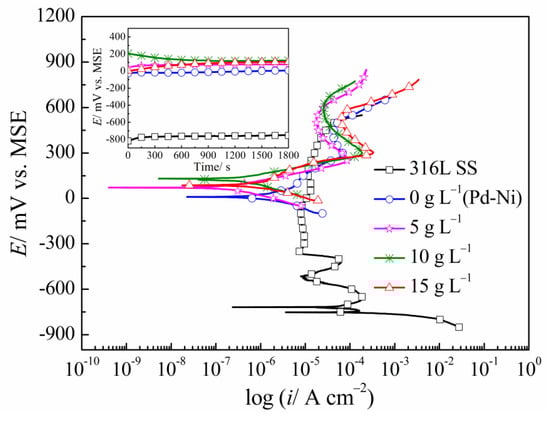 The OCP curves of various samples versus time in 60 °C sulfuric acid solution are depicted in Figure 9. For the 316L SS sample, the active dissolution with hydrogen evolution is observed during OCP measurements. Clearly, the OCP of the coated specimens have significantly increased compared with that of the stainless steel sample. A higher OCP indicates that the as-prepared coatings are a cathodic coating with regards to the 316L SS substrate. The potentials of all the coated specimens are stable during the test duration, and no corrosion phenomenon is observed during the measurements. In addition, the sample with the Pd-Ni alloy coating has a lower OCP than those of the samples with the Pd-Ni/TiO2 composite coating. Therefore, the addition of titania can increase the OCP of the Pd-Ni alloy, even with a reduction in the Pd content in the film (Figure 3). However, the OCP values of the sample with the composite coating are similar after 900 s, which suggests that there is no significant influence of the oxide particles adding on the thermodynamic property.