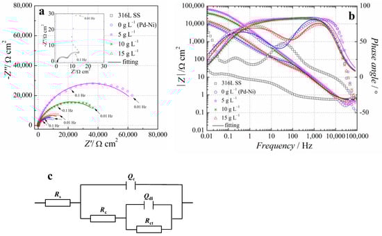 The electrochemical impedance of the Nyquist plots of samples with and without coatings in sulfuric acid at a high temperature is presented in Figure 10a. The Nyquist plots of 316L SS show the lowest impedance and have three parts. These data can be attributed to the high corrosion rate and probably the existence of intermediate corrosion products because the bare 316L SS was in an active dissolution state or active-passive transition state in hot 20 wt.% H2SO4 solution during the EIS measurement. Note that the coated specimens show significantly higher impedance values in comparison with that of the blank sample. Compared with the specimen-coated Pd-Ni alloy, the coating obtained from the electrolyte containing 5 g L−1 TiO2 has a larger impedance loop. However, with the further addition of TiO2 particles into the electrolytic bath, the impedance values of the obtained samples decrease.