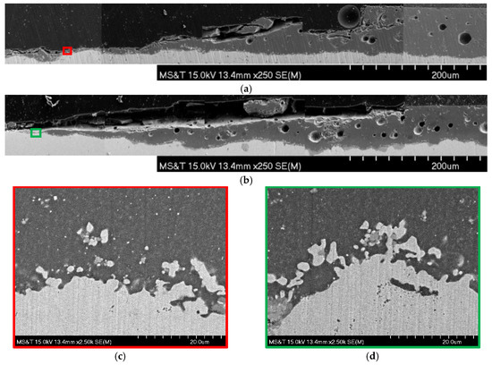 Figure 4c,d shows magnified details of the enamel–steel interfaces from Figure 4a,b. They show the extensive formation of an island-like structure in the enamel coating, during the firing process. In essence, a durable steel enamel interface transition zone was formed [15]. The island-like structure is iron-alloys, formed as a result of the chemical reactions of metal oxides in the enamel and the carbon and iron in the steel. No delamination was found after the corrosion tests; thus, the CP did not affect the mechanical condition of the interface between the enamel coating and steel substrate.