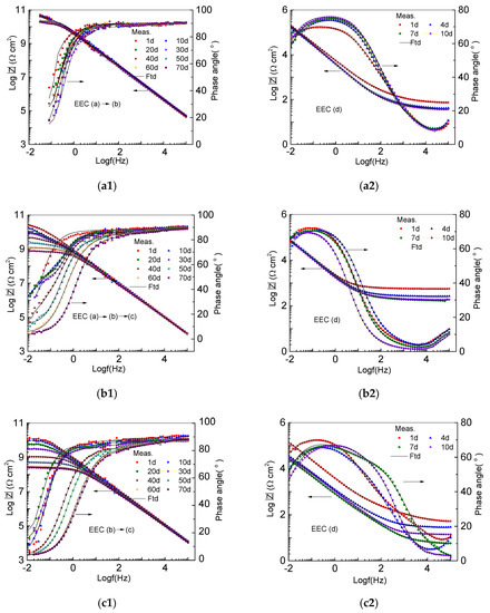 Figure 5 shows the EIS Bode diagrams of 3 representative samples tested under a cathodic potential of −1.15 V/SCE and −0.85 V/SCE, and an OCP, respectively in intact enamel coating (Figure 5(a1,b1,c1)) and damaged enamel coating (Figure 5(a2,b2,c2)). Both the measured (Meas.) data in various symbols and their fitted (Ftd.) curves are presented in Figure 4.