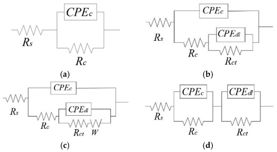 Equivalent electrical circuit (EEC) models for the samples tested (a) in the first 45 days under a cathodic potential of −1.15 V/SCE and in the first 10 days under a cathodic potential of −0.85 V/SCE on the intact coating zone; (b) from the 45th day to the end of test under a cathodic potential of −1.15 V/SCE and from the 15th day to the 45th day under a cathodic potential of −0.85 V/SCE on the intact coating zone; (c) from the 45th day to the end of test under a cathodic potential of −0.85 V/SCE on the intact zone; (d) on the damaged coating zone.