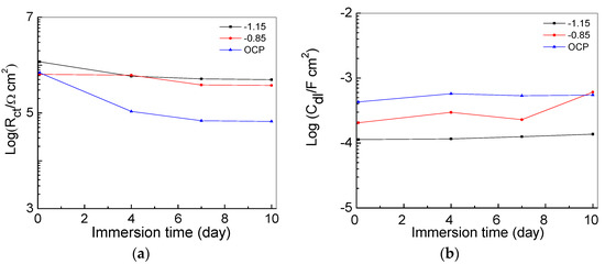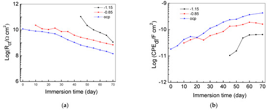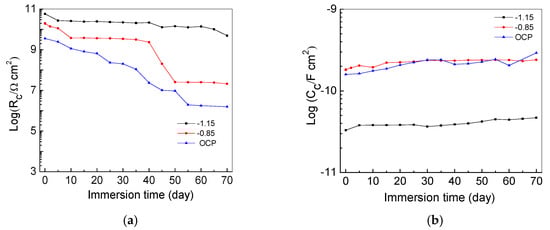Figure 7 shows the change of pore resistance Rc and capacitance CPEc of the intact coatings. In general, pore resistance measures the ease of electrolyte penetration into the coating, which is related to the number and distribution of open pores and pinholes in the enamel coating. The coating capacitance indicates the extent of electrolyte diffusion into the coating, which is associated with the thickness and dielectric properties of the coating [24]. The Rc value of the samples tested under −1.15 V/SCE decreased from 57.6 to 4.92 GΩ cm2, while the Rc value of the samples tested under −0.85 V/SCE and the OCP decreased more rapidly from 20.9 to 1.57 MΩ cm2 over 70 days. The coating capacitance of all the samples increased with immersion time, since the electrolyte solution gradually penetrated into the coating, thus increasing the coating capacitance. All the samples tested under the CP have larger coating resistances than the samples under the OCP. Thus, the CP improved the coating performance [2]. The sample tested under −1.15 V/SCE had a larger coating resistance and a smaller coating capacitance than the respective values of the sample under −0.85 V/SCE. This result indicates that a higher cathodic potential used in tests does not adversely affect the coating properties; it can decelerate the degradation process of the coating.