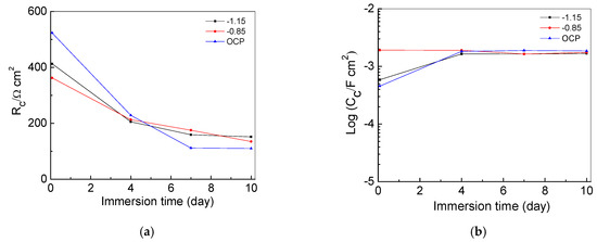 The Rc values of the damaged coating decreased rapidly over the immersion time as shown in Figure 8, which was measured in days (d). Specifically, the Rc value of the samples under the CP dropped from approximately 400 to 150 Ω cm2, while the Rc value of the samples under the OCP reduced more dramatically from 500 Ω cm2 in one day, to 110 Ω cm2 in 10 days; indicating the failure of coating in protecting the steel substrate. The CPEc values of all the tested samples reached nearly the same value of 2 mF·cm2 after 4 days of immersion. Therefore, after coating has been damaged, the CP has little effect on the coating performance.