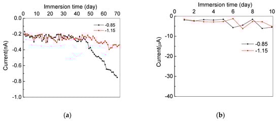 Figure 11a shows the variation of currents taken from the intact enamel coating zone under −0.85 vs. SCE/V and −1.15 vs. SCE/V. Each dot represents one measurement of data per day till the end of testing, after 70 days. For both samples the current fluctuated around −0.2 nA from the beginning to 45 days of immersion. Then, the sample tested under −1.15 V/SCE decreased slowly to approximately −0.3 nA at the end of testing, while the sample tested under −0.85 V/SCE decreased dramatically to approximately −0.8 nA at the end. Similarly, Figure 11b presents the variations of currents on the samples with damaged enamel coating. The currents of both samples eventually reached approximately −5 µA after 10 days of immersion, which are about 104 times larger than those of the respective test samples with the intact enamel coating. This is because more electrochemically reactive spots were generated. In all test cases, the measured current is always negative, implying that the CP current can flow through the coating along electrolyte pathways to reach the metal substrate and protect the steel from corrosion [25].