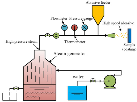 Erosion tests were carried out using a homemade erosive tester. The schematic of the erosion experiment is shown in Figure 1. The abrasive particles are fed into the high-speed steam and accelerated, then the particles are ejected from the steel tube nozzle to impact the coating. Irregular SiC powder with sizes in the range of 61–75 µm was used as abrasive. During the erosion process, the flow of the steam gas was fixed at 6.8 kg/h, and the feed rate of the abrasive was 5.12 g/min. A 6-cm nozzle-to-substrate distance was used, with an impingement angle of 90°. To produce an erosion scar with a well-defined geometry, the specimen surface was masked with a 20 mm diameter opening. Specimen mass was measured prior to erosion and after every 5.12 g of erodent feed.