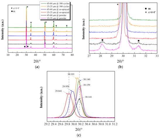 XRD patterns of YSZ feedstocks and coatings before and after the thermal cyclic test: (a) global analysis in a diffraction angle range from 10° to 80°; (b) detailed analysis in a diffraction angle range from 27° to 33° and (c) peak shift of XRD patterns of coatings during thermal cycling.