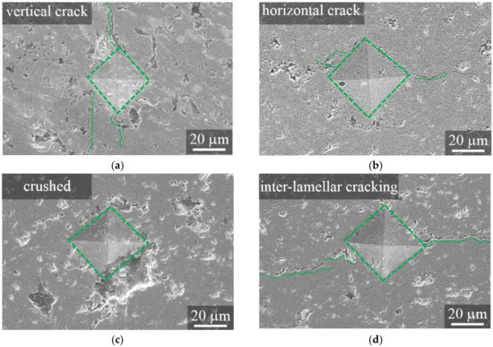 It is known that YSZ spallation is often related to crack initiation and propagation in the vicinity of the YSZ/bond coat interface [26]. Therefore, the cracking behavior in the coating under the action of indentation was studied in this study. Figure 6 shows four typical indentation morphologies under the same load conditions: indentation with vertical cracks, indentation with horizontal cracks, crushed indentation, and indentation with inter-lamellar cracking. The difference between inter-lamellar cracking and horizontal crack is judged by the crack length. Horizontal cracks exceeding the diagonal length of the indentation are considered to be inter-lamellar cracking. It can be seen that there is a great difference in the morphology of cracks generated near the indentation, and some indentations do not even cause cracks. Due to the complexity of the crack morphology, the fracture toughness of the coatings in this study could not be measured by the indentation method. Other publications have also pointed out that indentation-based measurement techniques are not very reliable for coatings, as they do not provide legitimate toughness values [12,27].