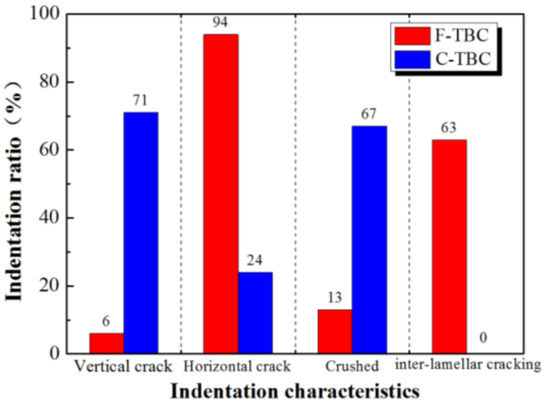 A bond coat with a roughness approximately in the range of Ra 5–10 μm provides good adhesion for the ceramic coating [17]. The roughness value Ra of C-TBC is about 3 μm, with a maximum amplitude of the surface profile of up to 8 μm. Therefore, such a rough interface facilitates the adhesion of the subsequent droplets with the previously formed coating surface during the plasma spraying process. Due to the good adhesion of the lamellar interface, it is difficult for the cracks to expand along the lamellar interface in C-TBC. In addition, the rough interface makes the crack propagation path twist and turn, which also increases the difficulty of crack expansion. As a result, intra-splat cracks perpendicular to the substrate (vertical cracks) are formed in C-TBC instead of cracking along the lamellar interface (horizontal cracks). From the statistics of the indentation characteristics in Figure 7, it can be seen that more than 70% of the indentations in C-TBC are accompanied by vertical cracks, and indentations accompanied by horizontal cracks are fewer than 25% with no inter-lamellar cracking. In contrast, the smooth lamellar interface in F-TBC could only provide limited mechanical bonding to accommodate splats. Thus, the cracking resistance of F-TBC is poor due to its susceptibility to cracking along the lamellar interface.
