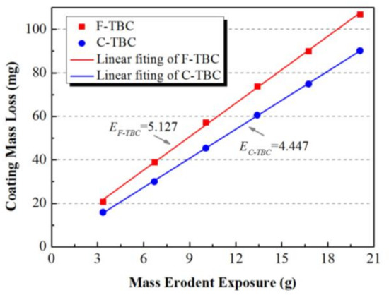 The erosion results are provided in Figure 9. From the ratio of coating mass loss to erodent exposure, it can be seen that the erosion rate of F-TBC is slightly higher than that of C-TBC. Since the erosion failure of the APS coating is mainly due to the delamination of the layered elements, the erosion performance of the coating mainly depends on the porosity, thickness of the lamellas and the bonding strength between the splats [28]. The pores and cracks in the coating may provide the starting sources for the peeling of the coating, and thus the erosion resistance of the coating decreases with increasing porosity [28,29]. In addition, according to Schmitt’s research, smaller splat size provides a lower surface roughness, which has been shown to reduce erosion rate by yielding smaller failure regions [30,31]. In this study, the porosity of F-TBC is lower than that of C-TBC, and the splat size of F-TBC is smaller than that of C-TBC due to the fine feedstock. However, the erosion resistance of F-TBC is worse than that of C-TBC, indicating that in addition to the size of splat and porosity, there are other more important factors that affect the erosion rate of the coating.