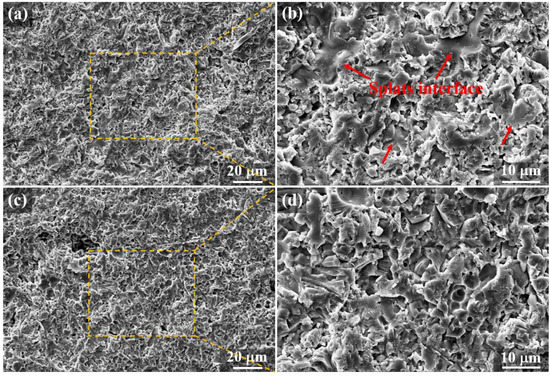 Surface morphology of the coatings after the erosion test. (a,b) F-TBC; (c,d) C-TBC.