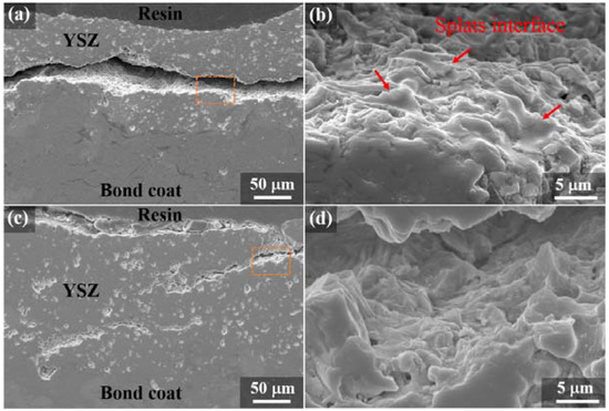 Previous study has found that the rate of crack propagation in coatings prepared with coarse YSZ powder is slower than that prepared with fine powder [22]. Based on the results of this study, it can be seen that the stacking morphology of splats has a great influence on the crack propagation behavior of coatings. The roughness of the lamellar interface may affect the cracking resistance of the coatings. A certain degree of roughness is conducive to increasing the resistance to transverse crack expansion along the lamellar interface. Therefore, in future studies, apart from the porosity, the effects of the splat interface on the performance of the coating should also be taken into consideration.