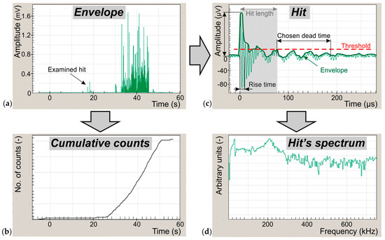 Parameters obtained from an acoustic emission (AE) analysis. (a) Compressed signal of complete AE record in form of the Envelope with (b) tracked exceedances of chosen amplitude threshold in form of the Cumulative counts. (c) Full time resolution AE event called Hit with its threshold described and (d) exported Spectrum.
