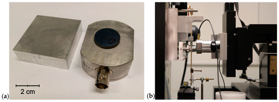 (a) Comparison of sample holders: traditional passive 5 cm × 5 cm specimen holder from duralumin (left) and the AE sample holder with built-in acoustic emission sensor and pre-amplifier (right). (b) Implementation of the AE holder into the NanoTest instrument.