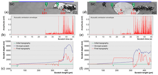 Advanced analysis of two ramped scratch tests on 00SiC sample with (a,d) the microscopic records, (b,e) the acoustic emissions records and (c,f) depth change records.
