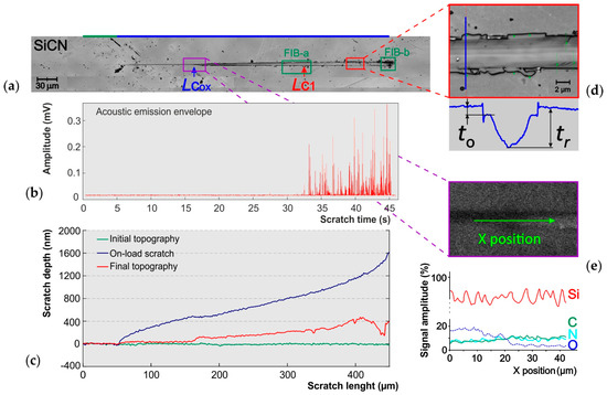 Detailed analysis of selected scratch test on sample SiCN with an oxidized surface using (a) microscopic record, (b) the acoustic emission record and (c) the depth change record. Detail (d) shows profile measurement of SiOx oxide film thickness and detail (e) shows the oxide SiOx film first penetration using the SEM-EDS linear mapping.