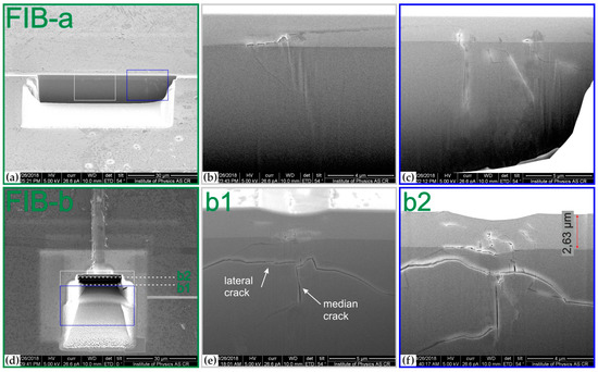 Typical residual scratch groove for the SiCN film with the N content of 36 at % is shown in Figure 4. At the first glance, using only microscopic evaluation one may conclude that coating seems to be scratched through in the area highlighted by the violet rectangle, while the first critical load LC1 is practically undetectable even if combined with the depth change record. Subsequent detailed analysis based on the depth profiling of the 3D high resolution confocal microscope image and especially the electron microscope (see Figure 4d,e, respectively) revealed the penetration of the oxide SiOx surface layer only (thus marked LCox), while the remaining unoxidized SiCN film remained intact. The exact point of scratching through the oxide layer was confirmed using electron microscopes’ EDS mapping technique [106] as can be seen from Figure 4e, where the green arrow indicates the direction of the linear mapping profile inside the residual groove; the corresponding spectra are shown below. The blue dashed line of oxygen signal drops exactly at the point where SiOx is scraped off. Another detail from the latter part of scratch track (see Figure 4d) shows the further evidence of the detached SiOx layer even with its thickness evaluation. Perpendicular profile using calibrated confocal microscope shows a sharp transition between the SiOx layer and the free surface of the SiCN film. Step measurement indicates thickness of SiOx layer of t0 = 100 nm. The coating itself proved to be unharmed since its plastic deformation at the deepest point of the residual groove is tr = 400 nm, which still does not reach the full coating thickness of 2.6 µm. Moreover, the acoustic emission record clearly shows signal increase around 33th second. This is probably the very same failure mode caused by the film–substrate interface cracking, as described in the previous case on SiC samples (shown in Figure 3) and evidenced in the FIB-milled longitudinal cross-section. The lateral and median cracks are clearly identified in the film and substrate as can be seen in Figure 5. A detailed inspection of the SEM image shows no evidence of through-thickness cracking as all the cracks were stopped within the film. This may be related to the compressive stress in the films [56]. The initial cracks occurrence coincides well with the critical load LC1 obtain from the AE record. With the increasing load, the cracking in both the film as well as the substrate is more pronounced as shown on the perpendicular cross-section, see Figure 5.
