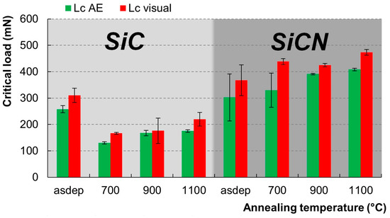 The strength of the simultaneous AE detection during the scratch test supplementing the traditional methods will be demonstrated for a-SiCxNy (y ≥ 0) films magnetron sputtered on silicon substrates. These SiC and SiCN films, depending on actual structure and composition, can possess high hardness [95], resistance to chemicals and abrasion even at high temperatures [96,97], as well high radiation resistance [98]. This excellent combination of physical and chemical properties makes them a very promising candidate for protective high temperature coatings [56,99,100]. It is especially the doping capability that allows tailoring of physical and material properties. For example, the imposed brittleness of the pure SiC can be partially suppressed by incorporation of N into the SiC structure. Besides, the band gap can be tuned by N content [101]. Since the a-SiC and a-SiCN films are often used in structural applications, their durability (including adhesion and cohesion) is of the highest importance and hence it has been studied extensively even in situ at elevated temperatures [102,103,104].