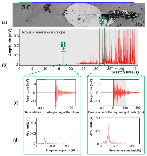 Detailed evaluation of specific observed AE hits. Firstly the microscopic record (a) was compared with the envelope of AE record (b). Then detailed evaluation in form of hit visualization (c) and hit’s spectrum (d) of two AE events belonging to the lone film crack (marked “1”) and jointly cracking of substrate and film (marked “2”). Note the different axis scale in both spectra (d).