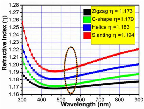 Refractive index (η) of SiO2 nanozigzag, nanohelix, slanting and C-shape nanofilms measured as a function of wavelength at 550 nm.