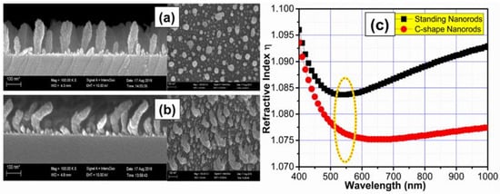 In order to prove and validate our findings of the nanostructure influence on the refractive index, we use the maximum glancing angle 88° and fabricate nanostructures with varying morphologies including standing [24], and C-shape nanofilms as shown in Figure 3. The experimental results show that, at such high oblique angle, there are minor differences in refractive index still existing at the nanolevel. The SEM top and cross-sectional images clearly indicate that nanofilms are highly oriented, well-spaced, homogenous, and separated. Figure 3a,b shows the standing nanorods, and C-shape nanofilms fabricated at a glancing angle of 88° with fast substrate rotational and slow rotation. Figure 3c shows the refractive index of SiO2 standing, and C-shape measured as a function of wavelength at 550 nm. The refractive index analysis shows that there is a very slight negligible influence of refractive index at a glancing angle of 88°. Overall morphology did not impact the refractive index at 88° and it lies in between 1.07–1.08.