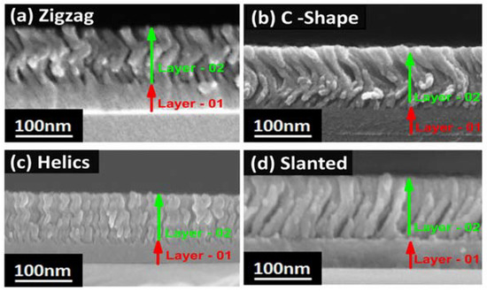 According to experimental requirements, the growing nanostructures morphology can be modified easily by monitoring the substrate rotational condition, stationary position, deposition angle, or the vapour flux arrival during the fabrication process. We also fabricate different morphologies of SiO2 nanostructures such as nanozigzag, nanohelix, slanting and C-shape SiO2 nanofilms by controlling and adjusting the substrate position as shown in Figure 1. Figure 1a represents the SiO2 nanozigzag film. The zigzag nanostructure can be easily established by instigating the vapour flux arrival direction to rotate the substrate holder by 180° repeatedly in clockwise and anticlockwise directions while the deposition angle was kept constant at 80° throughout the deposition process. Similarly, C-Shape nanofilms and nanohelics can be fabricated by rotating substrates at a constant rate comparative to the deposition rate. Thus, a columnar C-shape (0.06 Rev/min) or nanohelics (0.12 Rev/min) formation takes place comprised of constant pitches depending on the rotational speed of the substrate with respect to revolution per time.
