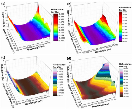 Practically in different optoelectronic appliances, AR coating encompassing wideband reflectance over a wide light incident angles (AOI) is mandatory and prerequisite. Here, we also determine the AR efficiency of our fabricated coatings at a different angle of light incidence via full angle reflection (FAR) operational mode. The omnidirectional AR capacity of bilayer SiO2 AR coating having different morphologies is shown in Figure 6.