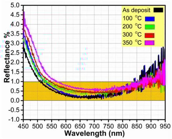 Annealing experiments were also performed to examine the AR proficiency of nanozigzag bilayer SiO2 coating at a higher temperature. The SiO2 AR coating was annealed for an hour at 100, 200, 300 and 350 °C with a ramp speed of 5 °C, as shown in Figure 8. At 100 °C, the as-deposited SiO2 AR coating and annealed SiO2 AR coating show nearly identical AR efficiency as there is no influence of annealing. At 200 °C and 300 °C, there is negligible slight declination in AR efficiency in comparison with as-deposited AR coating. However, the SiO2 AR coating shows <1% reflectance in the visible region retaining its AR performance. After annealing at 350 °C, a clear shift of reflectance minima is observed in comparison with as deposit AR coating. The AR efficacy of SiO2 AR coating at 350 °C deteriorates due to structural defects, lattice stresses, increased packing density or crystallization [34]. Overall, the SiO2 AR films are thermally stable up to 300 °C without any deterioration in AR efficiency. Beyond this temperature (350 °C), there is a slight increment in AR efficiency due to induced crystallinity, which influences packing density of thin films in the declining of the AR efficacy [34].