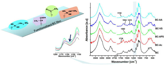 - Shao, W.; Wu, J.; Liu, H.; Ye, S.; Jiang, L.; Liu, X. Novel bioactive surface functionalization of bacterial cellulose membrane. Carbohyd. Polym. 2017, 178, 270–276. [Google Scholar] [CrossRef] [PubMed]