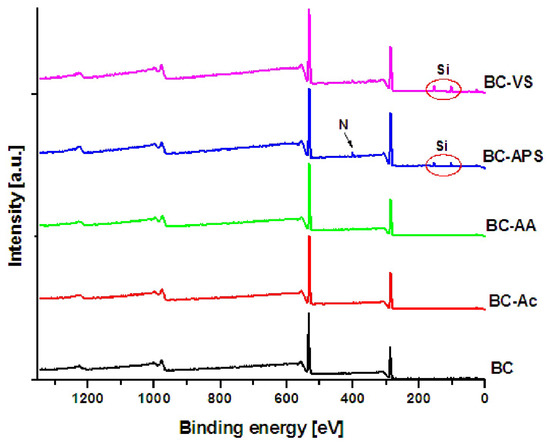 - Pothan, L.A.; Simon, F.; Spange, S.; Thomas, S. XPS Studies of Chemically Modified Banana Fibers. Biomacromolecules 2006, 7, 892–898. [Google Scholar] [CrossRef] [PubMed]