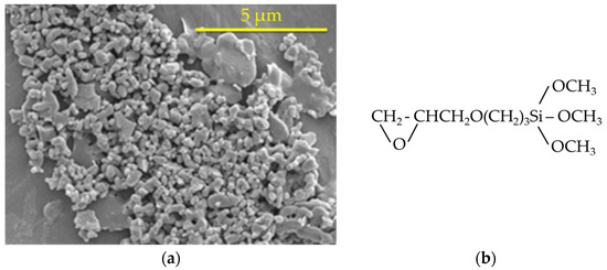 (a) SEM image of the alumina particles; (b) Chemical structure of the silane coupling agent used in this work, (γ)-Glycidoxypropyl-trimethoxy silane [26].