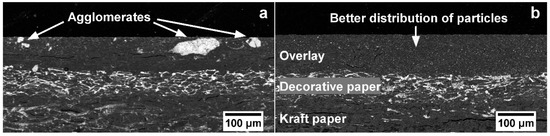 Five types of laminates were manufactured by assembling a MF impregnated overlay paper containing alumina particles with a MF pre-impregnated decorative paper and two PF pre-impregnated kraft papers. The impregnation of the overlay paper was performed manually using a No. 9 Tan meter bar (RK Print Coat Instruments, Hertfordshire, UK). The impregnation resin was prepared by adding a curing agent (0.6 wt %), wetting agent (0.1 wt %), and slip agent (0.1 wt %) to a MF pre-condensate. Alumina particles (functionalized or non-functionalized) were added in two different concentrations: 5 and 10 wt %. A reference laminate without particles was prepared for comparison. After impregnation, the coatings were allowed to dry at room temperature for three to four days before being pressed for 1 h at 115 °C and 7.35 MPa using a Fontijne press LPB 300 apparatus (Fontijne Presses, Barendrecht, The Netherlands).