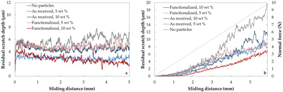From Figure 4a, the best performing laminate was the one containing 10 wt % of functionalized alumina particles, showing the lowest scratch depth. Compared to the laminate with 10 wt % of as-received particles, the scratch depth was more than halved from the original value (from an average 5 µm for the last two mm for the non-functionalized to 2.1 µm for the functionalized). Differences were also observed for the 5 wt % of load, however, the laminate with the as-received particles performed better, which shows that the amount of incorporated alumina particles is important. The worst performing laminate was the one containing no particles, confirming that the presence of ceramic particles is crucial.