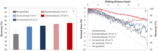 The post-micro scratch test elastic recovery of the laminates is presented in Figure 6, Figure 6a shows the constant load of 10 N and Figure 6b shows the progressive load from 0 to 10 N. The recovery/healing properties were high in general and were the highest for the laminates with functionalized particles. For the laminates containing 10 wt % of functionalized alumina particles, the recovery was above 80% at the end of the scratch.