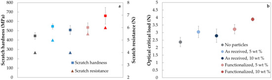 Higher recovery and higher scratch hardness were also obtained with particle functionalization. When recovery takes place, the bottom of the scratch moves upwards [39], and the residual depth Rd is much shallower than the penetration depth Pd. The more elastic the recovery, the smaller the scratch visibility, and these results correlated well with the visual observation results shown in Figure 7. The correlation between scratch morphology and scratch visibility is however very intricate, as it depends on may factors such as sample color, illumination, angle and duration of inspection, psychological perception as well as the size and type of damage [38]. Here, the large recovery in the scratch depth seems to be favored by the presence of the functionalized particles and it is likely that this decreased the brittleness of the polymer. The parameters influencing the recovery appear to be complex and the addition of particles can contribute to the recovery by increasing the free volume in the composite [40,41]. The phenomenon has been observed, for example, when adding silica particles, both micro- and nano-sized, to acrylic-based polyurethane coatings [41]. In this work, both non-functionalized and functionalized particles contributed to the increase in elastic properties and therefore the scratch resistance, but the functionalized particles did so to a larger extent. The same conclusion could be reached when examining the values for the critical loads, which were also higher for the laminate with a high content of functionalized alumina particles.