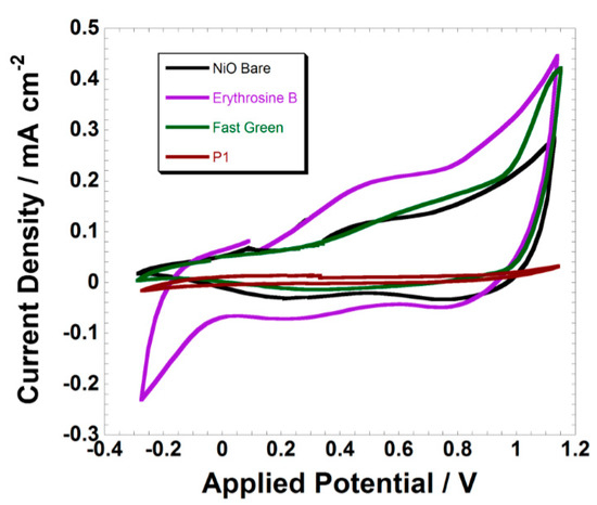 The adoption of P1 as a sensitizing agent has a clear effect of NiO surface passivation towards the redox processes of Equations (1) and (2) (brown-reddish trace in Figure 2) in accordance to previously reported data, which referred to the P1-sensitized NiO electrodes deposited via rapid discharge sintering (RDS) [75]. This is not the case of ERY-sensitized NiO (violet trace in Figure 2), because the presence of the sensitizer amplifies the current wave associated with the oxidation of NiO with respect to the electrochemical response of the bare oxide (black trace in Figure 2). Moreover, the NiO electrode sensitized with ERY does not display any additional redox peak or a potential shift of the oxidation peaks with respect to pristine NiO. This combination of findings evidences that the ERY sensitizer does not alter the nature of the redox processes NiO undergoes (Equations (1) and (2)). The verification of a decrease of the open-circuit potential going from the bare NiO to the ERY-sensitized version indicates that ERY mainly acts as an electron-donor towards NiO with consequent increases of the number of surface sites prone to electrochemical oxidation. Thus, a process of the following type can be predicted: