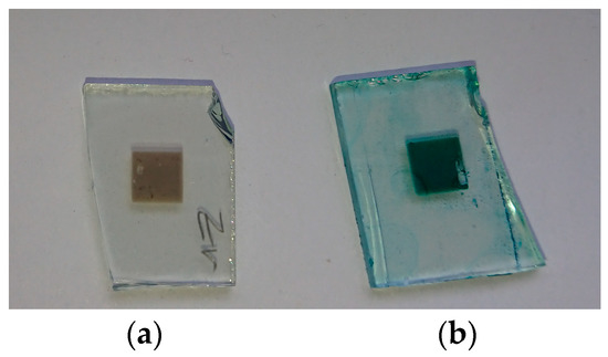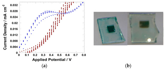 The first cycle of DS_46-sensitized NiO in Figure 4 is characterized by the presence of two irreversible current peaks (Figure 4a) that do not appear in the successive scans (Figure 4b). We attribute this sequence of events to the combined oxidation of DS_46 and NiO during the first cycle with successive peeling-off of the dye from the substrate. In the first cycle, the process of NiO oxidation (Figure 2 and Figure S5) is completely masked by the much ampler wave of current associated with DS_46 oxidation. The amplitude of the oxidation peaks of DS_46 is ca. 10 times larger than the amplitude of the peaks characteristic of NiO oxidation. In the successive cycles, the current peaks we attributed to the oxidation of DS_46 were no longer present. Moreover, the voltammograms of the successive cycles recall the ones of the bare NiO within the same potential range (comparison between the voltammetric profiles in the left frame of Figure 4 and the black trace of Figure 2). The hypothesis of the detachment of DS_46 consequent to its surface oxidation is supported by the observation of electrode decoloration after the treatment of electrochemical cycling (Figure 5 and Figure S6). An analogous electrochemical behavior has been observed when screen-printed NiO was sensitized with the other squaraines DS_35, DS_44, VG_1, VG_10, and VG_11 (see Figures S7–S11 in the Supplementary Materials). The electrochemical behavior of the screen-printed NiO sensitized with the series of squaraines considered here is consistent with the findings reported in previous works about the electrochemical and photoelectrochemical properties of various NiO samples sensitized with the commercial squaraine SQ2 [72,93,94].