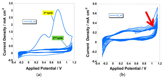 (a) First 20 voltammograms of the DS_46-sensitized NiO electrode at the scan rate of 100 mV s−1. The first two cycles are indicated; (b) Stabilization of the voltammogram of the DS_46-sensitized electrode after the first cycle, evidenced in the left frame. The red arrow indicates the sense of variation of the current profile upon the increase of the number of cycles. See Figure S2 for the visualization of the dye structure.