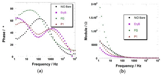 (a) Variation of the phase of the electrochemical impedance with the frequency of the potential stimulus for the cells with the bare, ERY-, P1-, and FG-sensitized NiO as the working electrode; (b) Variation of the impedance modulus with the frequency of stimulus for the four cells analyzed in the left frame.