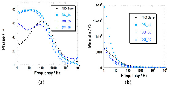 (a) Variation of the phase of the electrochemical impedance with the frequency of the potential stimulus for the cells with the bare, DS_35-, DS_44-, and DS_46-sensitized NiO as the working electrode; (b) Variation of the impedance modulus with the frequency of stimulus for the four cells analyzed in the left frame.