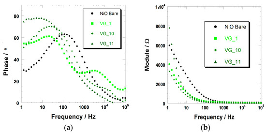 (a) Variation of the phase of the electrochemical impedance with the frequency of the potential stimulus for the cells with bare, VG_1-, VG_10-, and VG_11-sensitized NiO as the working electrode. (b) Variation of the impedance modulus with the frequency of stimulus for the four cells analyzed in the left frame.