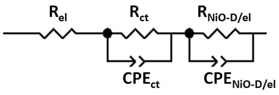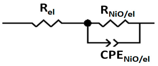 Model of equivalent circuit for the fitting of the electrochemical impedance spectroscopy (EIS) data recorded at the potential of the open circuit of three-electrode cell with the bare NiO as the working electrode. Rel: the sum of all the resistances due to the circuital elements except the working electrode. RNiO/el: resistance of the charge transfer through the interface created by the bare NiO and the electrolyte; CPENiO/el: element of the constant phase, which refers to the charge distribution during the process of the charge transfer through the interface created by the bare NiO and the electrolyte.