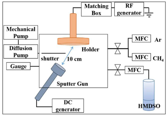 The DC magnetron sputtering system with RF bias and plasma polymerization was used to deposit SiOx:DLC films on B270 glass substrates. The B270 substrates were obtained by I-MEI Materials Co., Ltd., (New Taipei, Taiwan) and successively cleaned in acetone, isopropanol, and deionized (DI) water for 10 min in each substance by ultra-sonication, and dried using nitrogen gas. Figure 1 schematically depicts the deposition system, which involved a carbon target (99.99% purity and 3 inch in diameter) and a substrate holder that was connected to an RF power source with a frequency of 13.56 MHz. The sputtering chamber was pumped down to 3 × 10−5 torr using a diffusion pump prior to the deposition. The working gas was methane (CH4), the organic silicon monomer was HMDSO, and the working pressure was 3 × 10−3 torr. In this process, HMDSO was ionized by plasma polymerization to supply SiOx dopant.