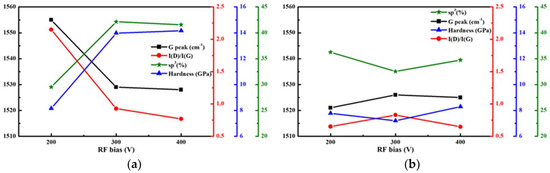 The analysis of DLC properties in the RF bias range of 200–400 V (a) with, and (b) without DC power of 50 W with CH4 flow rate of 15 sccm. (CH4 = 15 sccm, thickness: (a) 470 nm and (b) 110 nm).