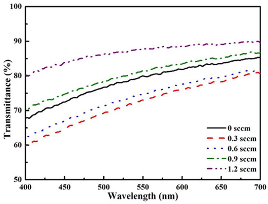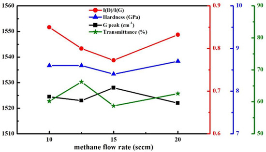 Carbon source of DLC films deposited in this system were provided from CH4 plasma. Under the above conditions of an RF bias of 400 V and a DC power of 50 W, DLC films were fabricated using various CH4 flow rates as shown in Figure 4. The wavenumber of the G peak was between 1522 and 1528 cm−1 at a CH4 flow range of 10 to 20 sccm. The I(D)/I(G) ratio and the hardness showed that the structures and the mechanical properties of the DLC films did not significantly change. The highest transmittance of the DLC films in the visible region was 66.2%, which was achieved at a CH4 flow rate of 12.5 sccm, which was therefore used in the rest of this study. The hardness and the thickness of the DLC films were 8.6 GPa and 133 nm, respectively.