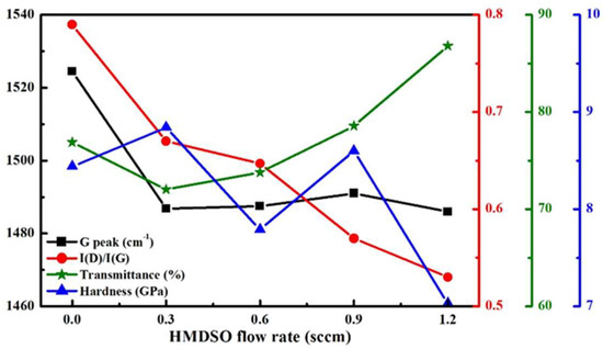 The analysis of DLC properties and transmittance at the different HMDSO flow rates. (RF bias = 400 V, DC power = 50 W, CH4 = 12.5 sccm, thickness = 65 ± 5 nm).
