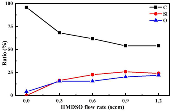 The X-ray photoelectron spectroscopy (XPS) relative atomic content of C, Si, and O at the different HMDSO flow rates. (RF bias = 400 V, DC power = 50 W, CH4 = 12.5 sccm, thickness = 65 ± 5 nm).